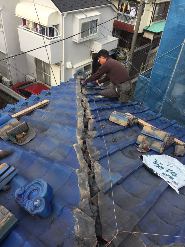 調布市で、日本瓦の棟を積みなおしています(屋根修理リフォーム)。