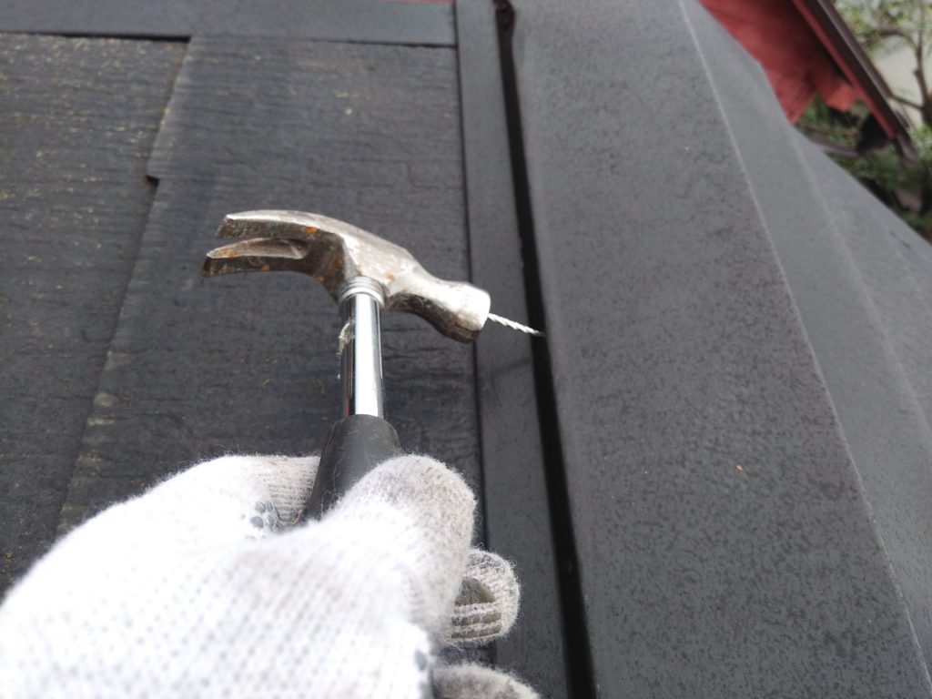 スレート屋根のてっぺんに付いている棟板金は釘の打ち直しなどのメンテナンスを放置していると高い確率で強風で飛ばされますのでメンテナンスは必須です。