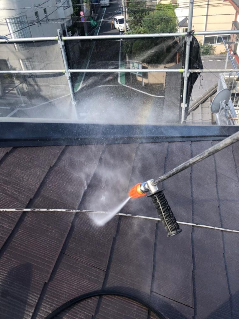 10年以上たったコロニアル(スレート)屋根ですのでコケやカビが大量に付着していたので時間をかけて高圧洗浄を念入りにしました。