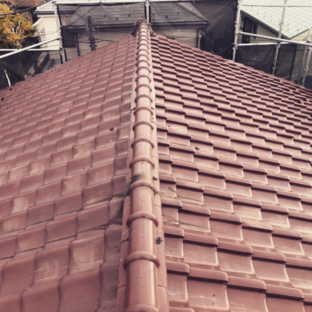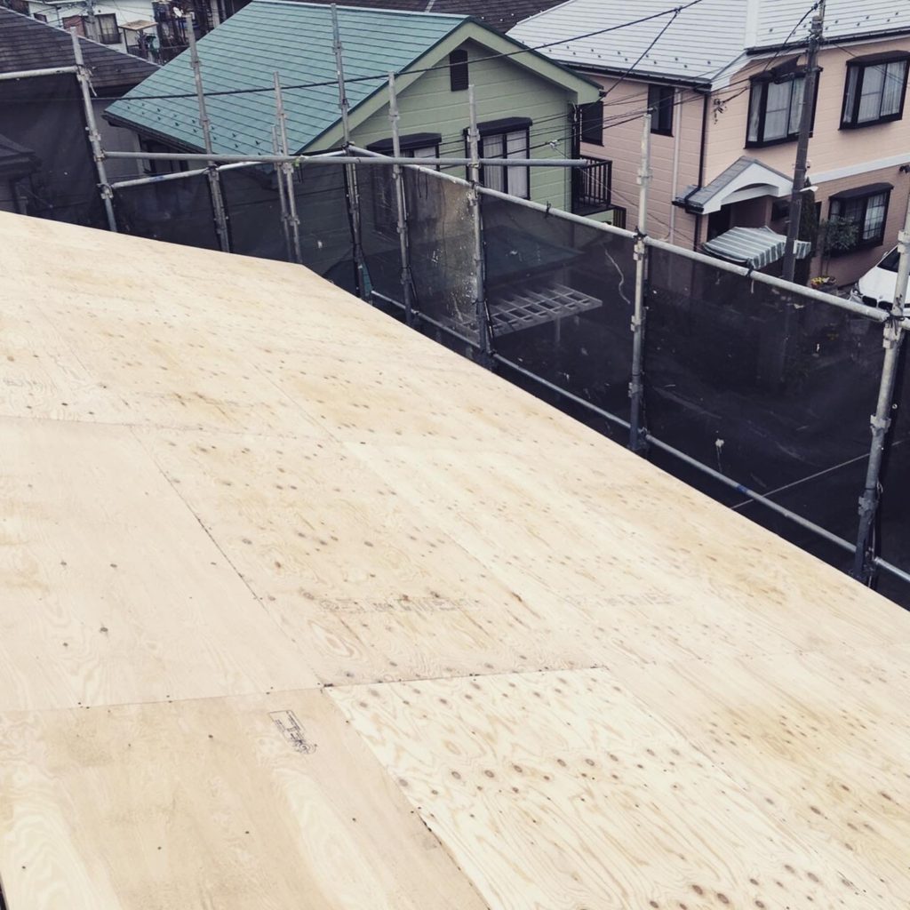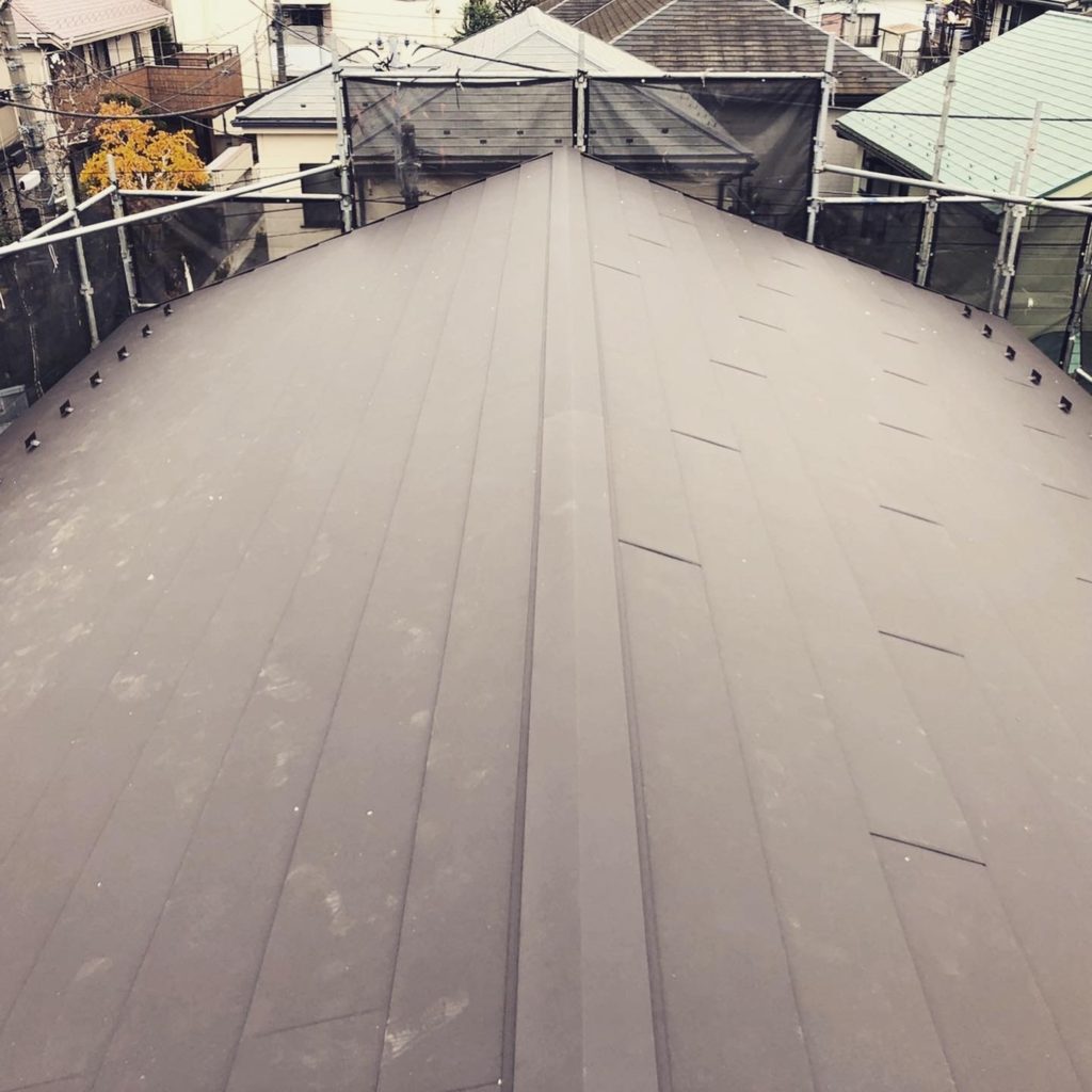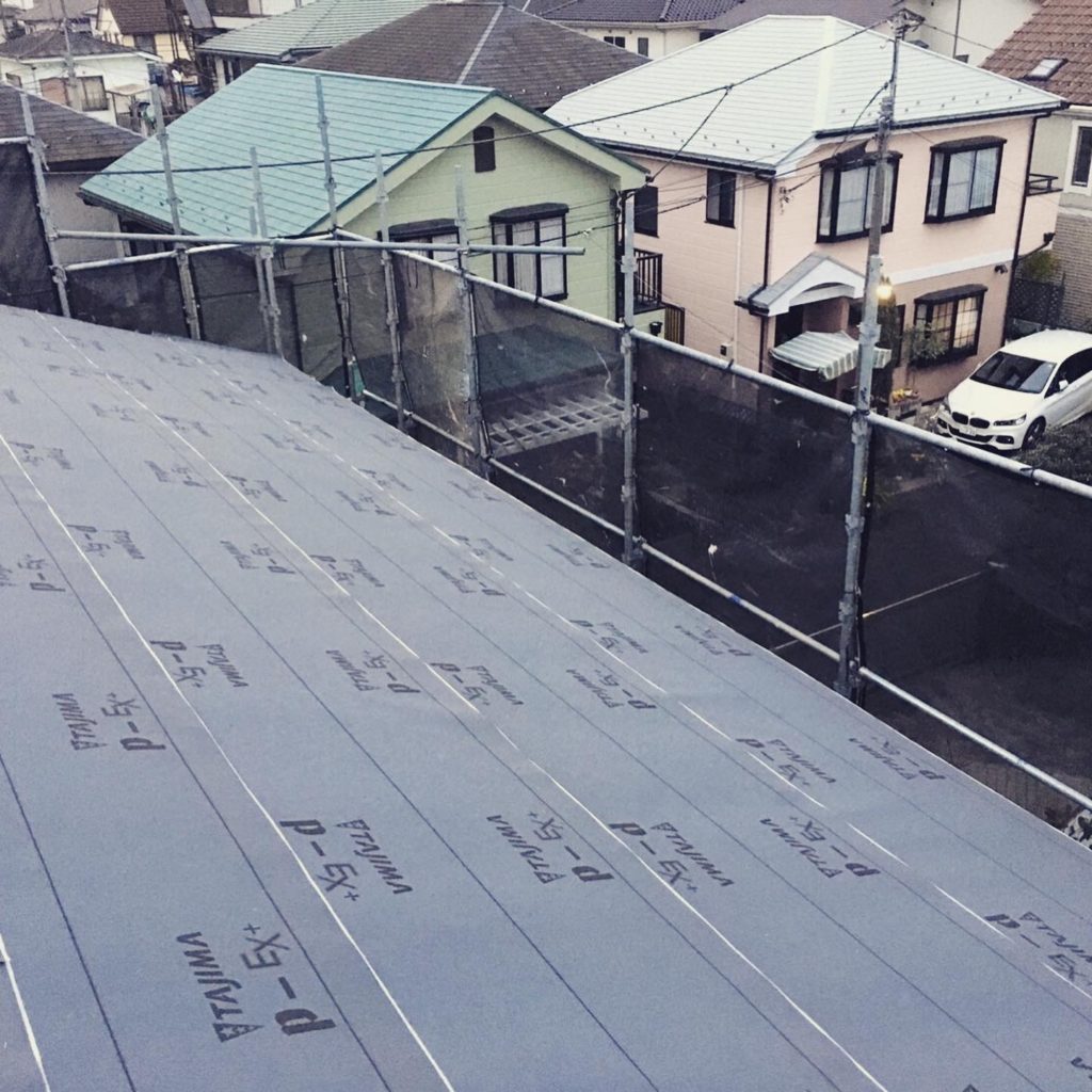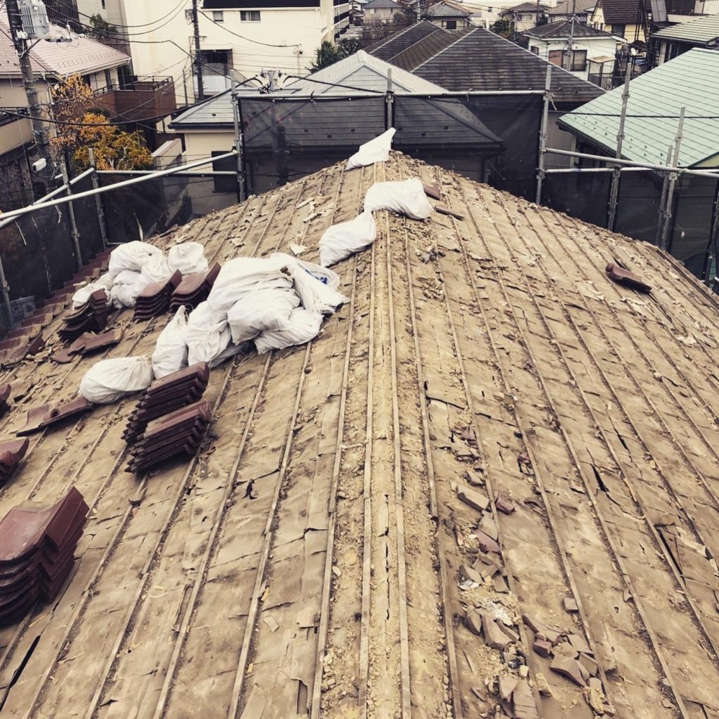 中野区で築20年以上屋根リフォームや、修理をしていなかった瓦屋根です。台風の後に屋根から雨漏りしたため、大規模な屋根の葺き替え工事をされました。瓦をはがすと下地には無数の穴や痛みが生じていました、20年も経つとこのような状況になります。下葺き、ルーフィング(防水シート)をしっかりやり直して、軽くて劣化しずらく断熱効果のある屋根材のガルテクトを葺きました。