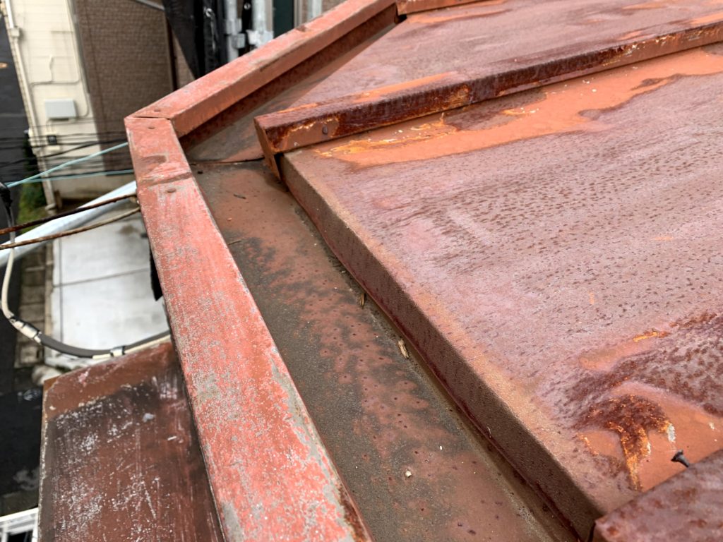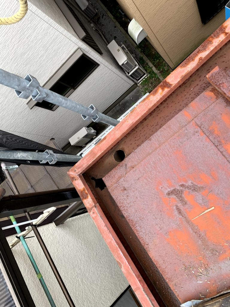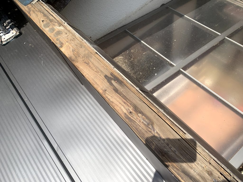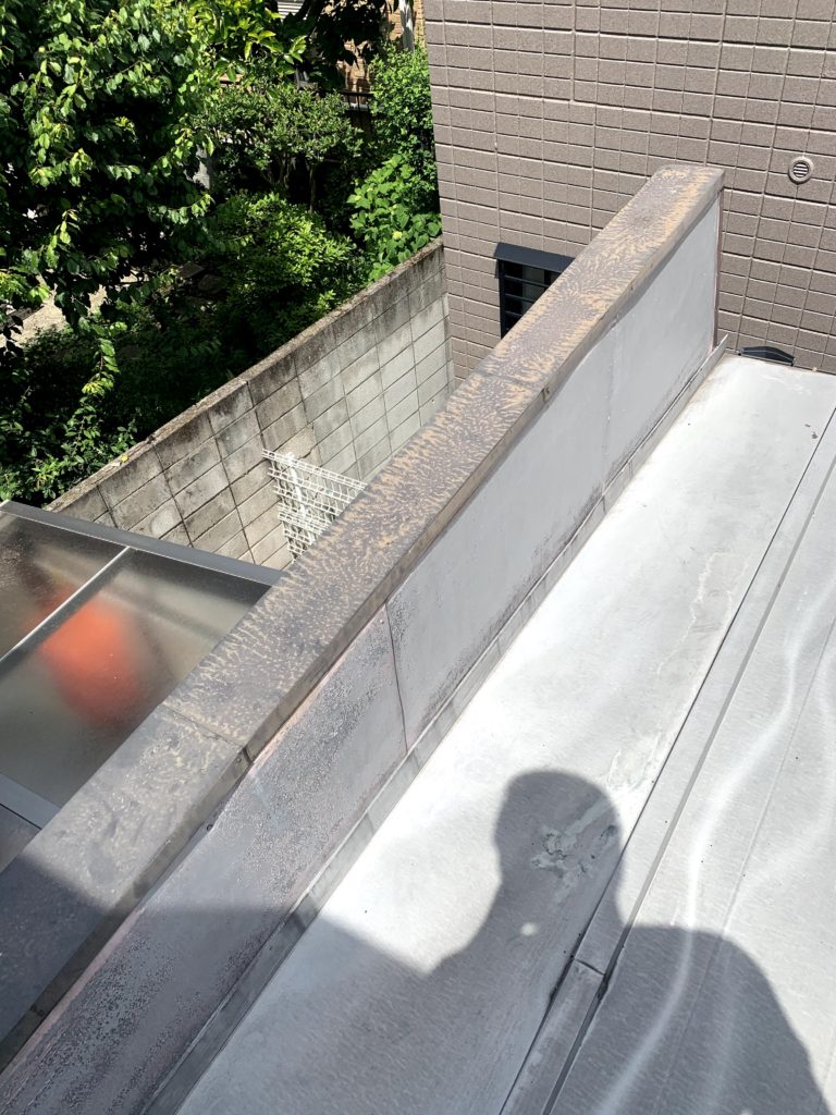 パラペット屋根の立ち上がった外壁の上に付いている防水の笠木のつなぎ目が劣化すると雨水が侵入して雨漏りします。定期的なつなぎ目のシーリングのメンテナンスや塗装をする事ですが、雨漏りがひどい場合や錆が出て腐食している場合は剥がして中の木材ごと笠木交換が必要です。